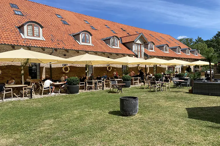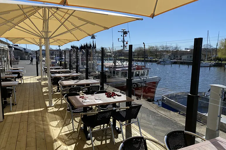 Bahama parasoller Jumbrella 5×3 m i färgen vete och ClickitUp höj- och sänkbart vindskydd som vindskyddar och ramar in uteserveringen med bibehållen utsikt över hamnen.