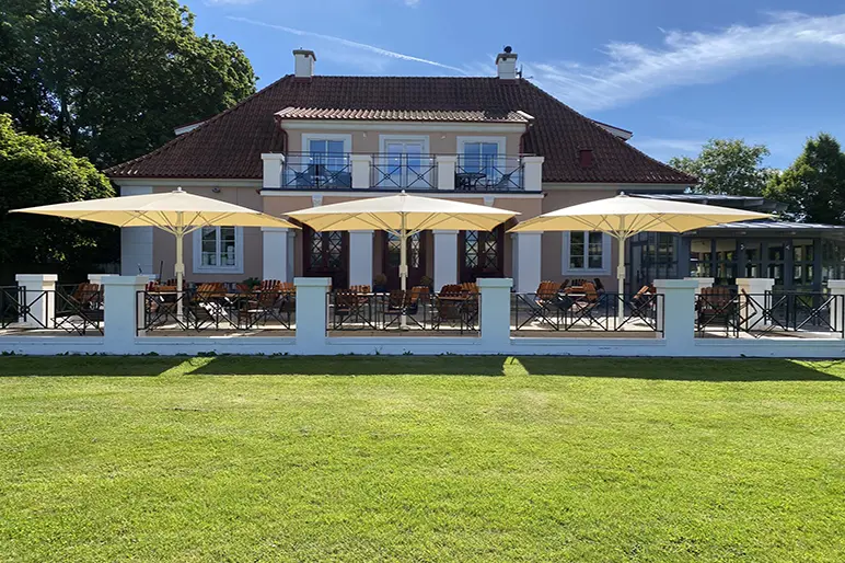 Bahama parasoller XL 7×6 m i färgen merlot vinröd som täcker en stor yta för maximal skugga. Klassisk belysning och specialsydda hängrännor. På uteserveringen finns även en Topbox utebar.