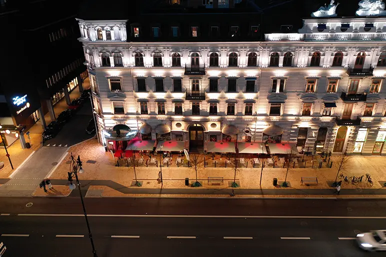 Bahama parasoller 4,5×4,5 m i färgen guld, integrerad kvartsvärme med fjärrkontroll och Classic belysning. Hela takterrassen som ligger 50 m upp, är inramad med guldfärgat ClickitUp höj- och sänkbart vindskydd.